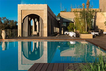 Once the summer palace of Louis Hubert Gonzalve — a French statesman, marshal and colonial administrator who lived between 1854 and 1934 — the Hotel Saharai blends history with modern elegance. The structure is a minimalist fusion of exposed Taza sandstone, floor-to-ceiling windows and contemporary Italian furnishings, reflecting refined Moroccan luxury.